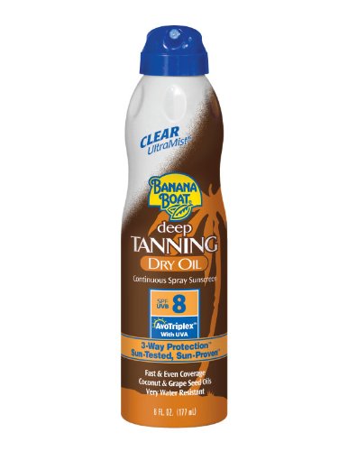 - Banana Boat Ultra Mist Tanning Dry Oil Continuous Clear Spray, SPF 8 provides fast and even coverage with one touch.